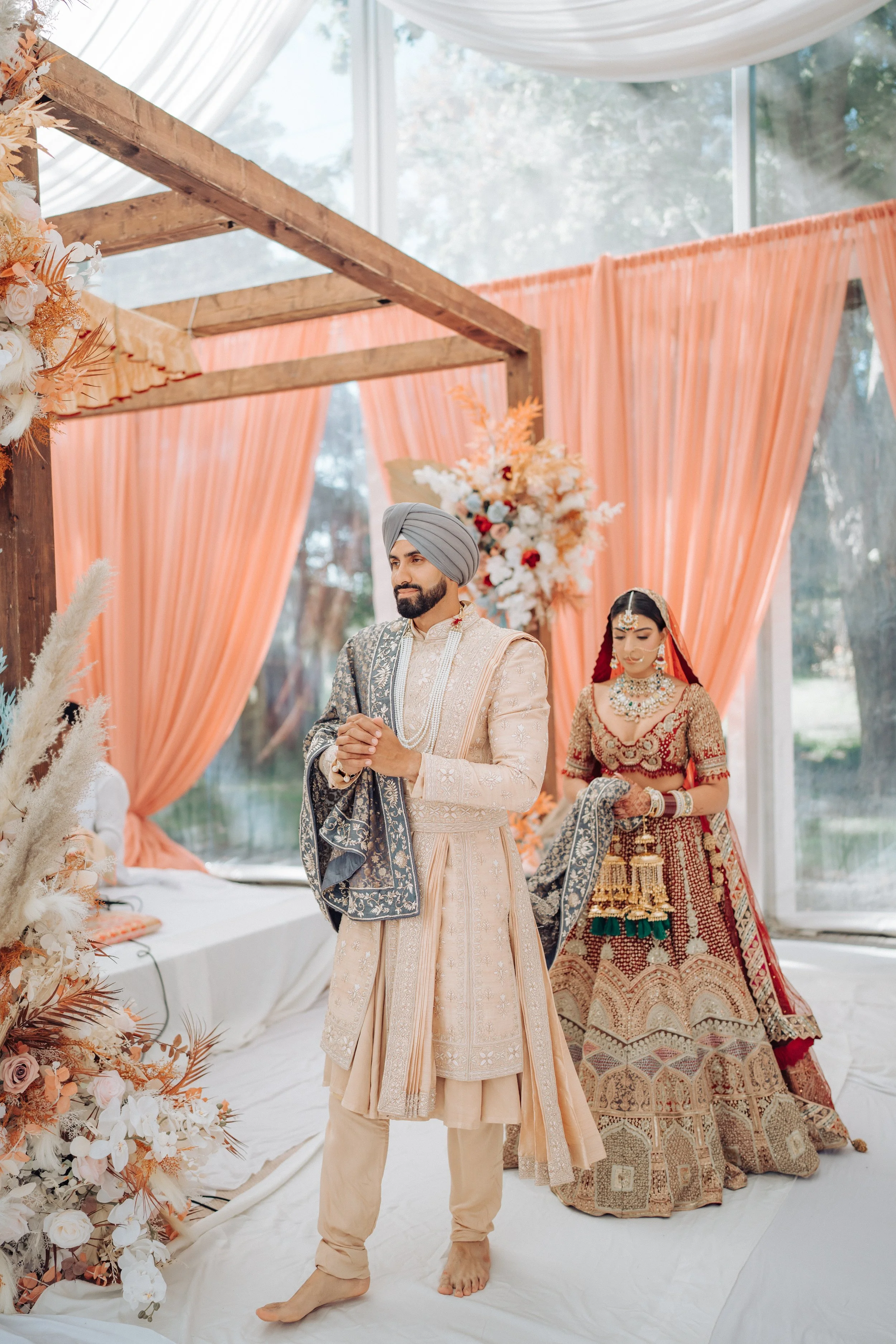 When it came to their outfits, Eneet and Sunny aimed to add a unique twist to traditional attire. Eneet was drawn to the idea of wearing red but wanted her look to stand out from other brides. Sunny chose a distinctive gray and beige color scheme for his outfit, which complemented Eneet’s attire and added a modern touch. Eneet’s red outfit featured colorful accents, which inspired her to choose a colorful jewelry set instead of traditional gold. She also personalized her Kaleere with hanging threads for a unique flair. “The culmination of these choices felt authentic to us and reflected our personalities beautifully,” Eneet explains. “Our outfits were curated to showcase our individual style, making our wedding day truly memorable.”