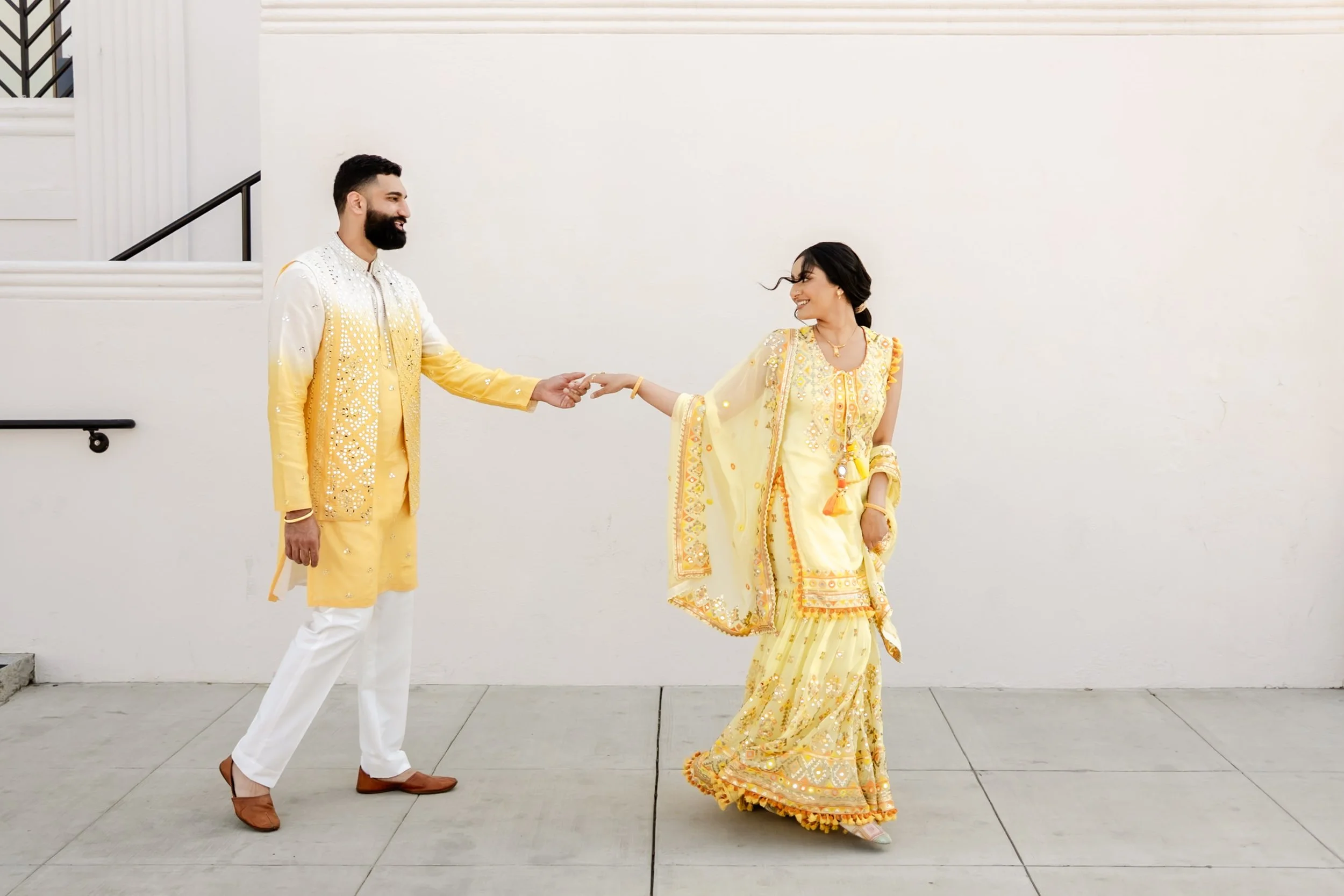 Their trips to India were highlights of the planning process. They took one trip for about a month in May 2023, and another month-long trip in October 2023. “We enjoyed working with all the different designers and shops and ended up loving every single one of our looks!” Jiwan shares.