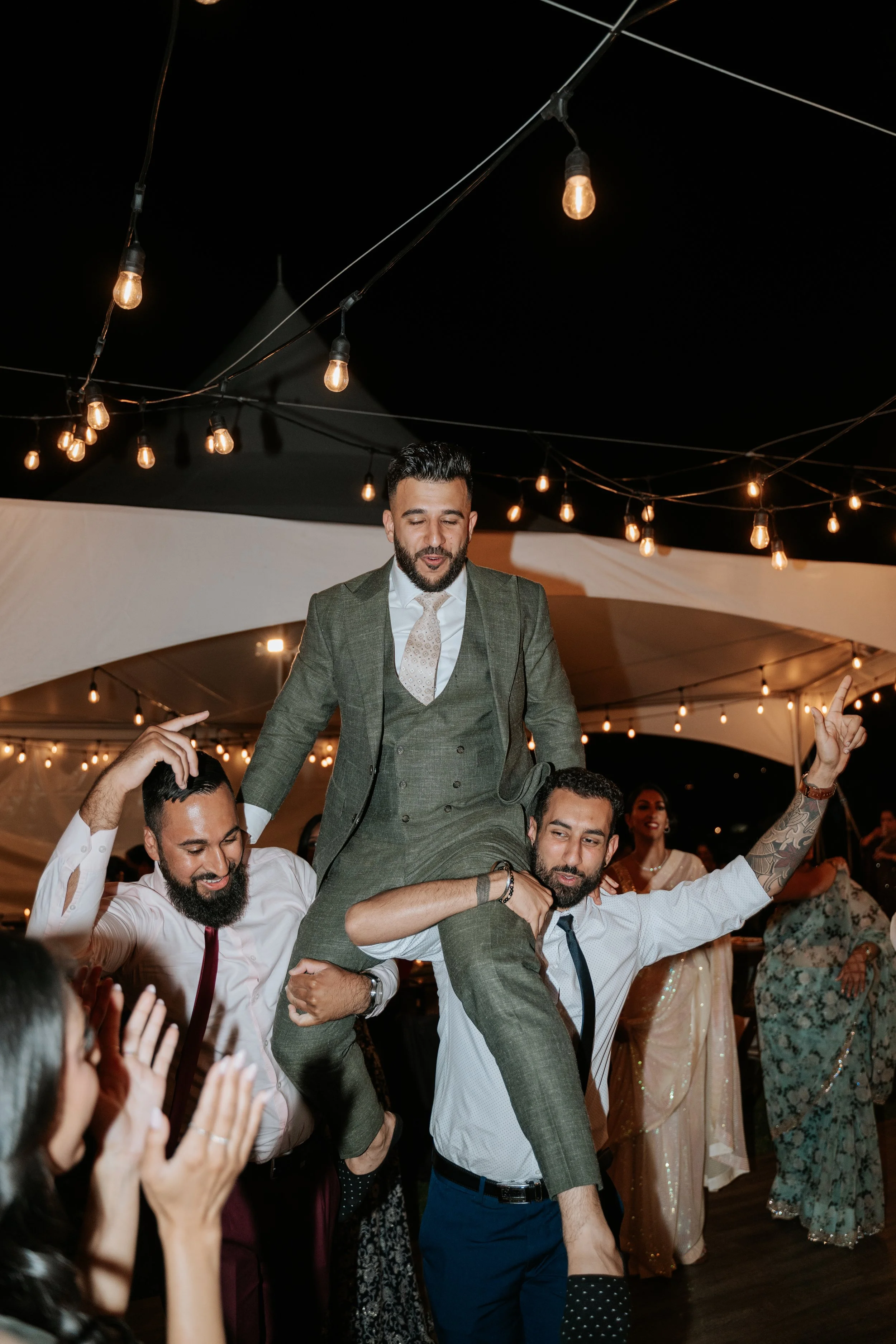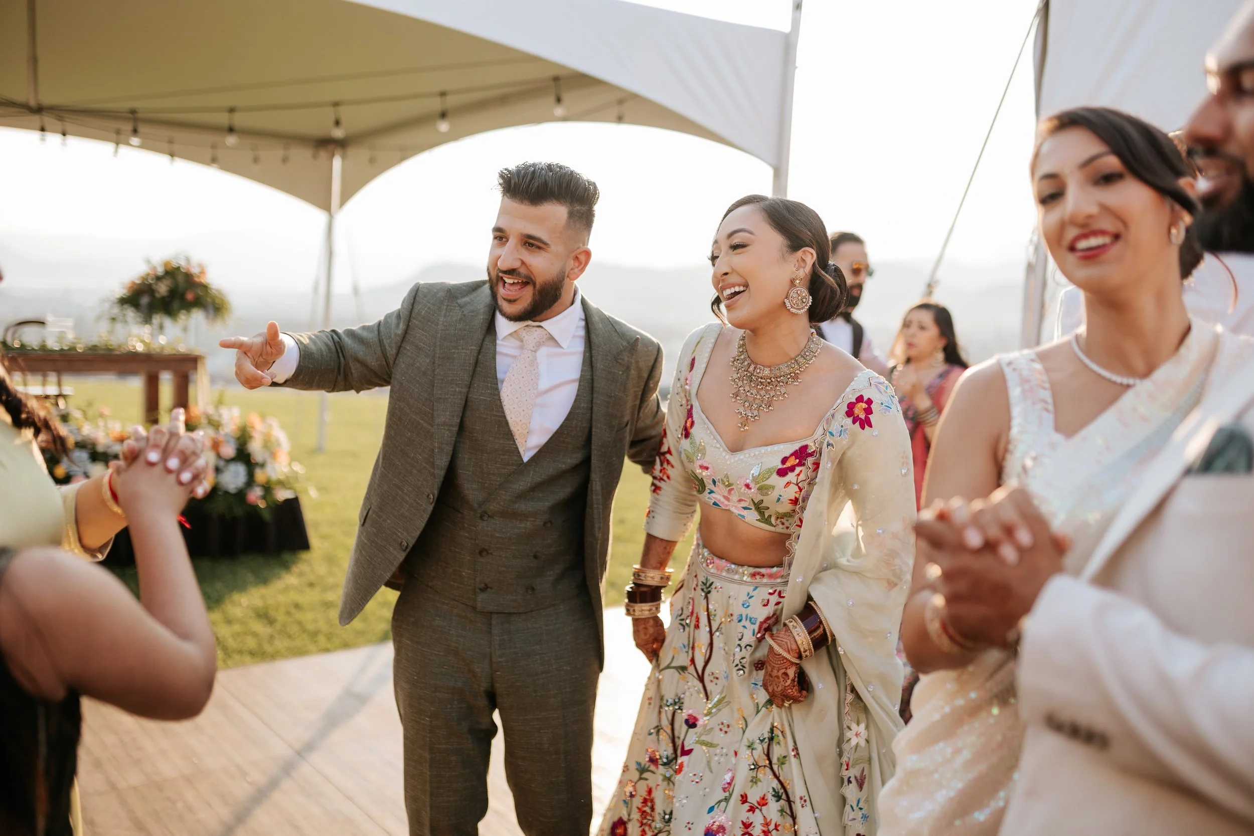 One of their favorite moments happened just before their big day, during Akash’s Bakara party. While they’d talked about crashing each other’s events during the planning phase, it didn’t seem possible since both had the same events on the same days, and neither wanted to leave their families behind. But Maskeen’s side had a last-minute change of heart the night before.