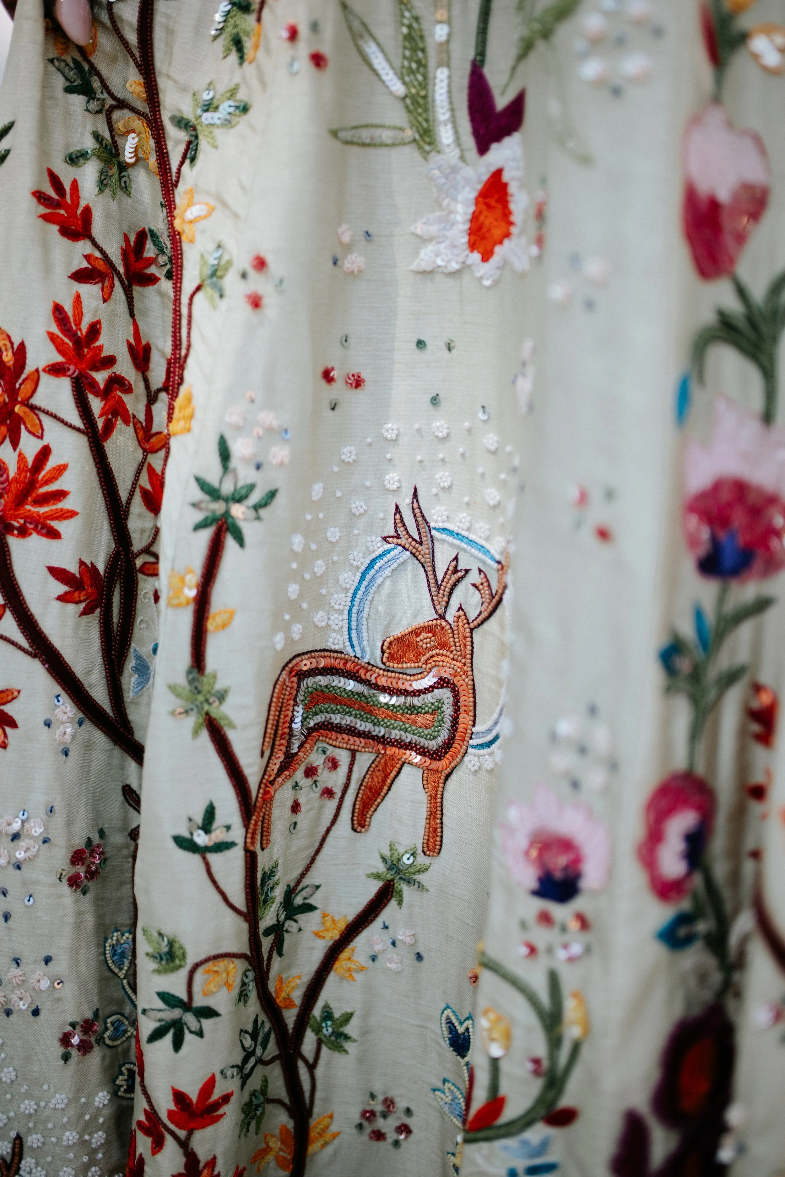 Her reception lehenga came with its own challenges. With an outdoor venue in mind, she needed something summery that would look beautiful in the sun. “A typical reception lehenga wouldn’t suit an outdoor venue,” she explains. After trying on several options that didn’t match her vision, she found it: a sage lehenga embroidered with branches, flowers, and even a deer.