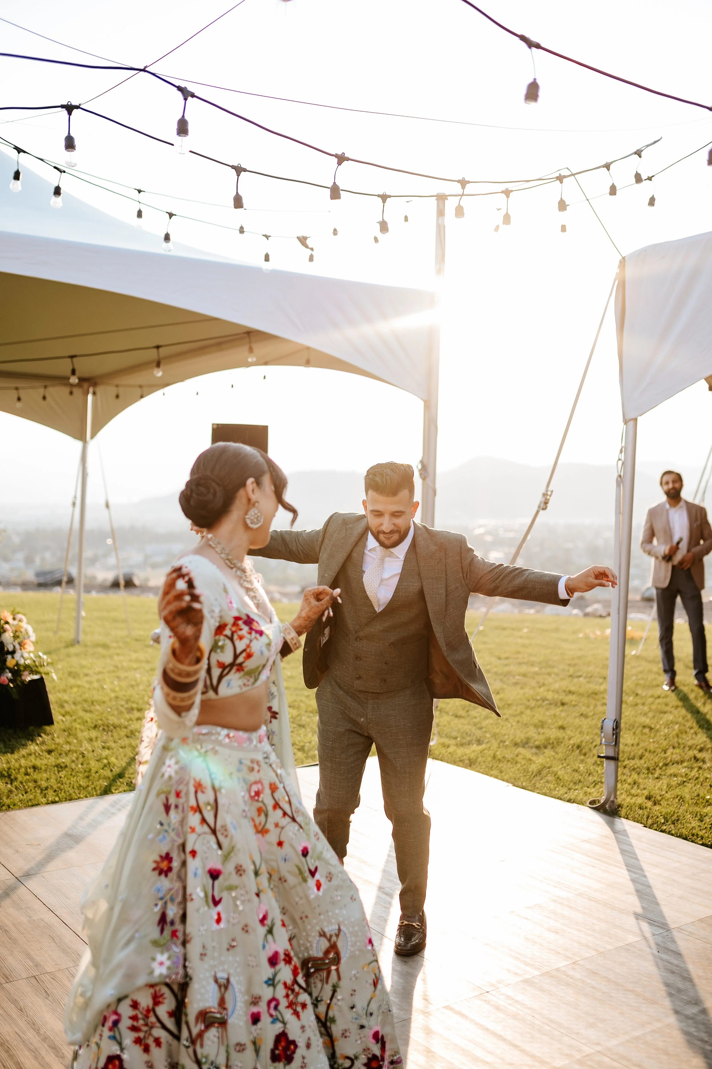 But Akash wasn’t done yet. After she said yes, he told her they were going to dinner, but of course, that was just the cover story. When they arrived, Maskeen walked into a room filled with 50 of their closest friends and family, all clapping and cheering. “Pure shock x2,” she says. “He really hit the hammer on the proposal. It was the perfect day and night.”